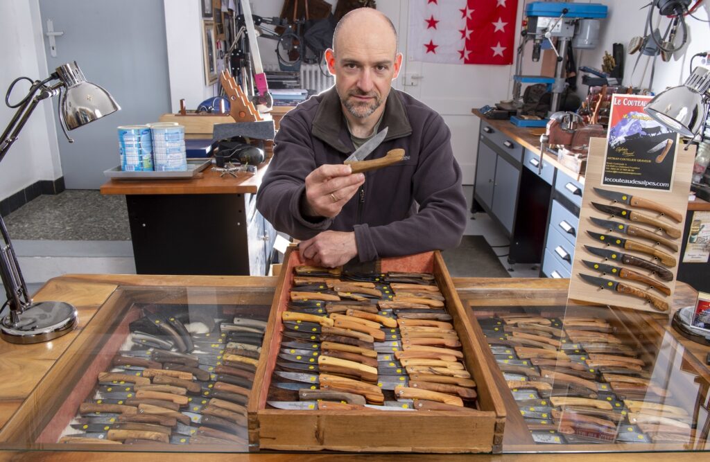 Né en 1973 dans le Queyras, j’ai été formé armurier à Liège, puis j’ai lancé ma propre activité de coutellerie artisanale en 2002. Depuis la fin de 2017, l’atelier est installé à Châtelard‑Frontière, à quelques mètres de la France. Je suis aujourd’hui le seul coutelier professionnel de l’arc alpin à assurer l’intégralité du processus de fabrication 100 % à la main, sans aucune sous-traitance.